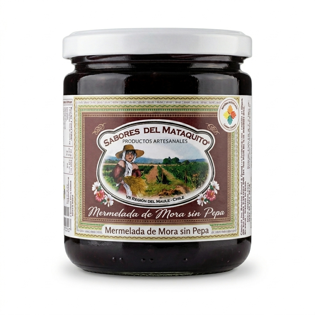 Mora Silvestre recolectada en la cuenca del Mataquito. Su proceso consiste en colar el fruto retirando las pepitas, obteniendo una verdadera crema de Mora de textura suave y sabor intenso. Un producto artesanal único del Maule.
